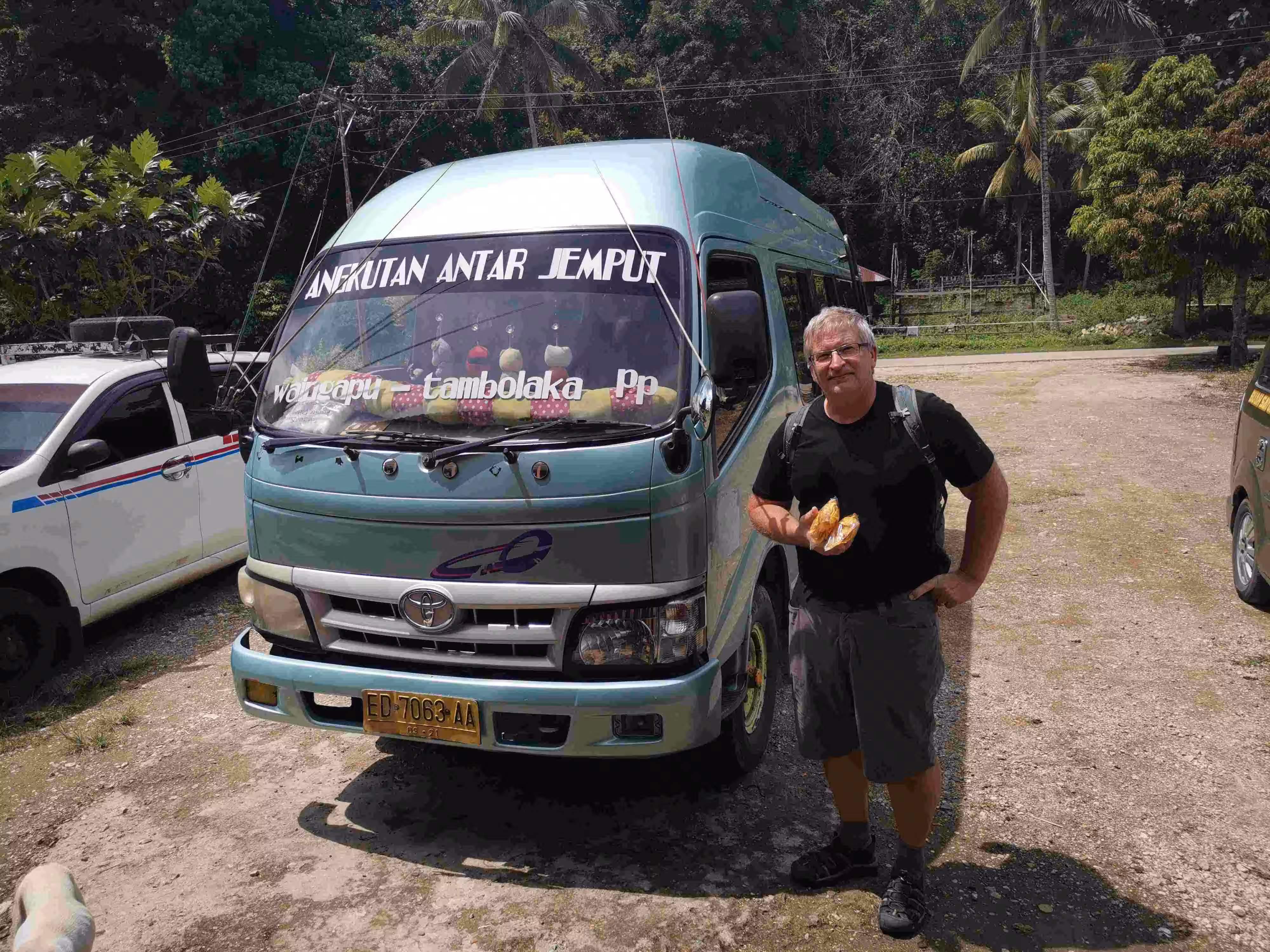 2020.02.18 – Waingapu – Waikabubak[Sumba Island] (Indonesia) – Our first order of business for the day was to drop by the old bus station nearby in order to buy bus tickets for our next town – Waikabubak. Thankfully, we chatted with the pastor before leaving for the bus station. He gratefully offered to drive us to buy our tickets for a shuttle van service to Waikabubak. Without his help we would have never found the building where sold the tickets for the shuttle service. With our tickets in hand, the pastor drove us back to our homestay. After our modest courtesy breakfast, the shuttle van picked us up at our homestay at 8:30am. The shuttle van picked up a few more people before we left Waingapu for Waikabubak. The local scenery along the way was very enjoyable. At a lunch stop, I bought some banana chips which cost 10,000 rupiah, and by mistake I handed over a 100,000 bill and stepped away. Later, the young girl who helped her grand mother sell the banana chips came to see me to hand over the change. Once in Waikabubak, the shuttle van dropped us at our hotel. We felt a bit reassured by the fact that some hotel staff spoke some English. After our check-in, we had a late lunch at the hotel’s restaurant. It rained heavily for a few hours late afternoon. As the rain stopped, we walked two kms to a pleasant restaurant for our evening meal.