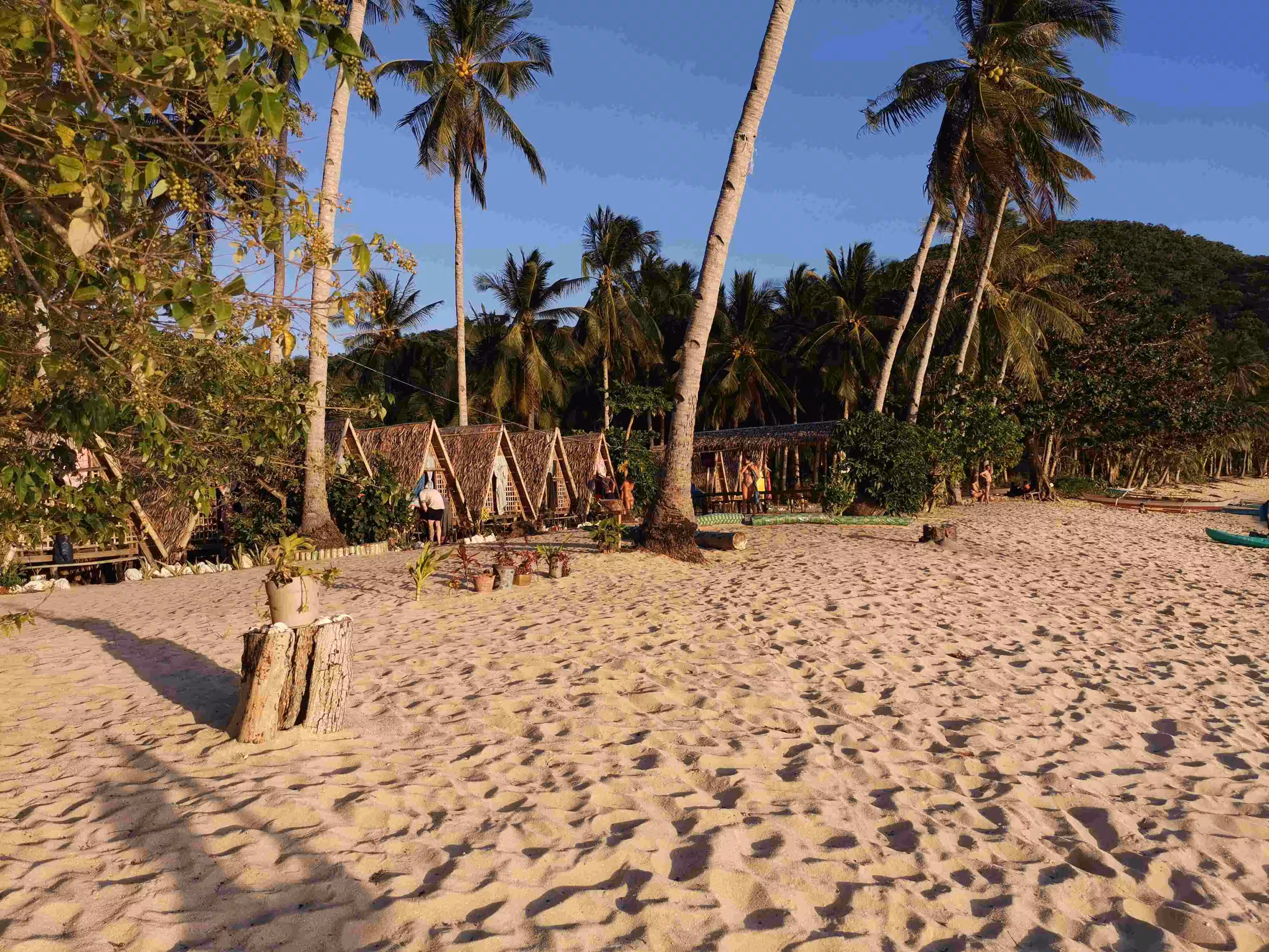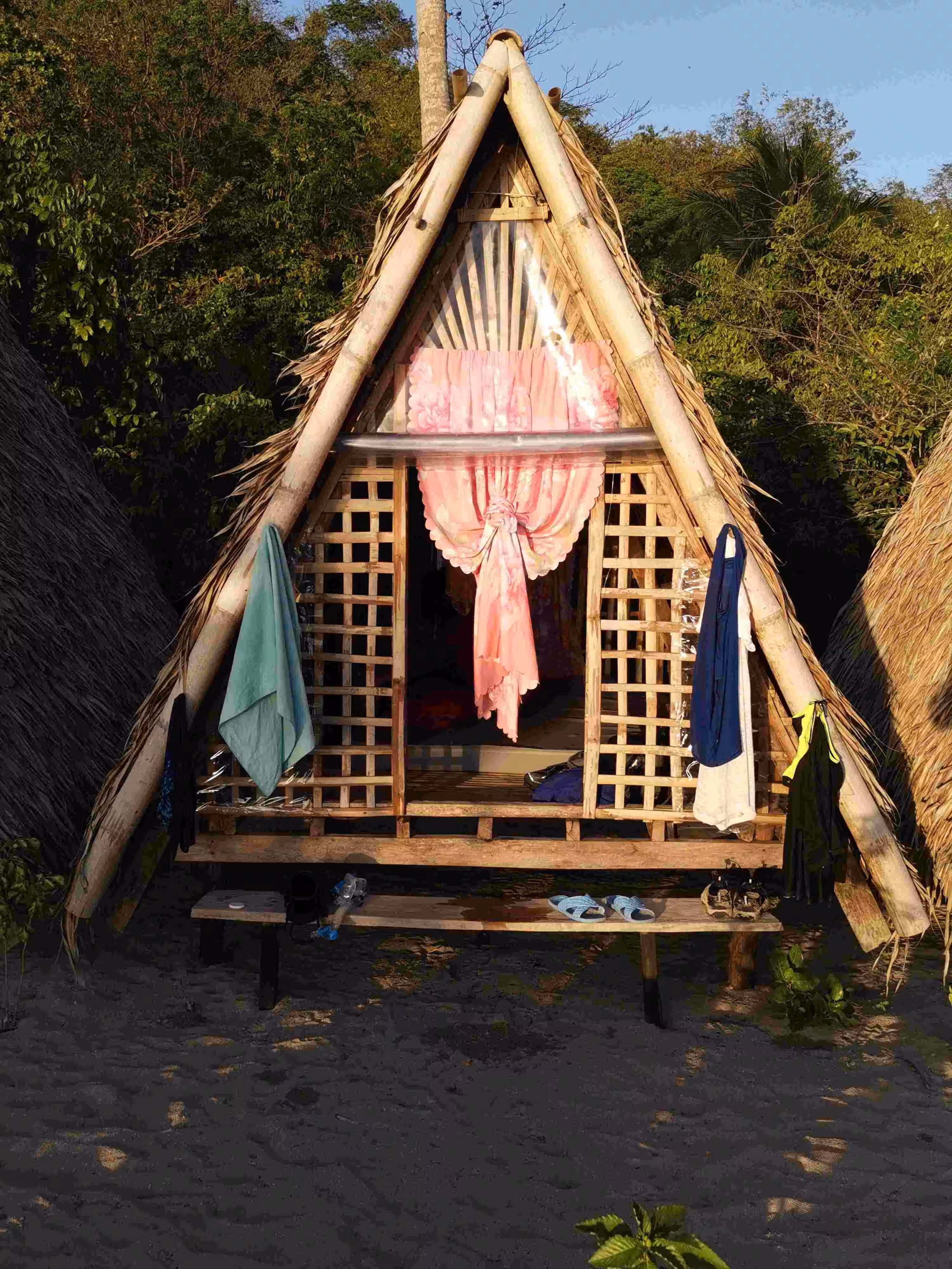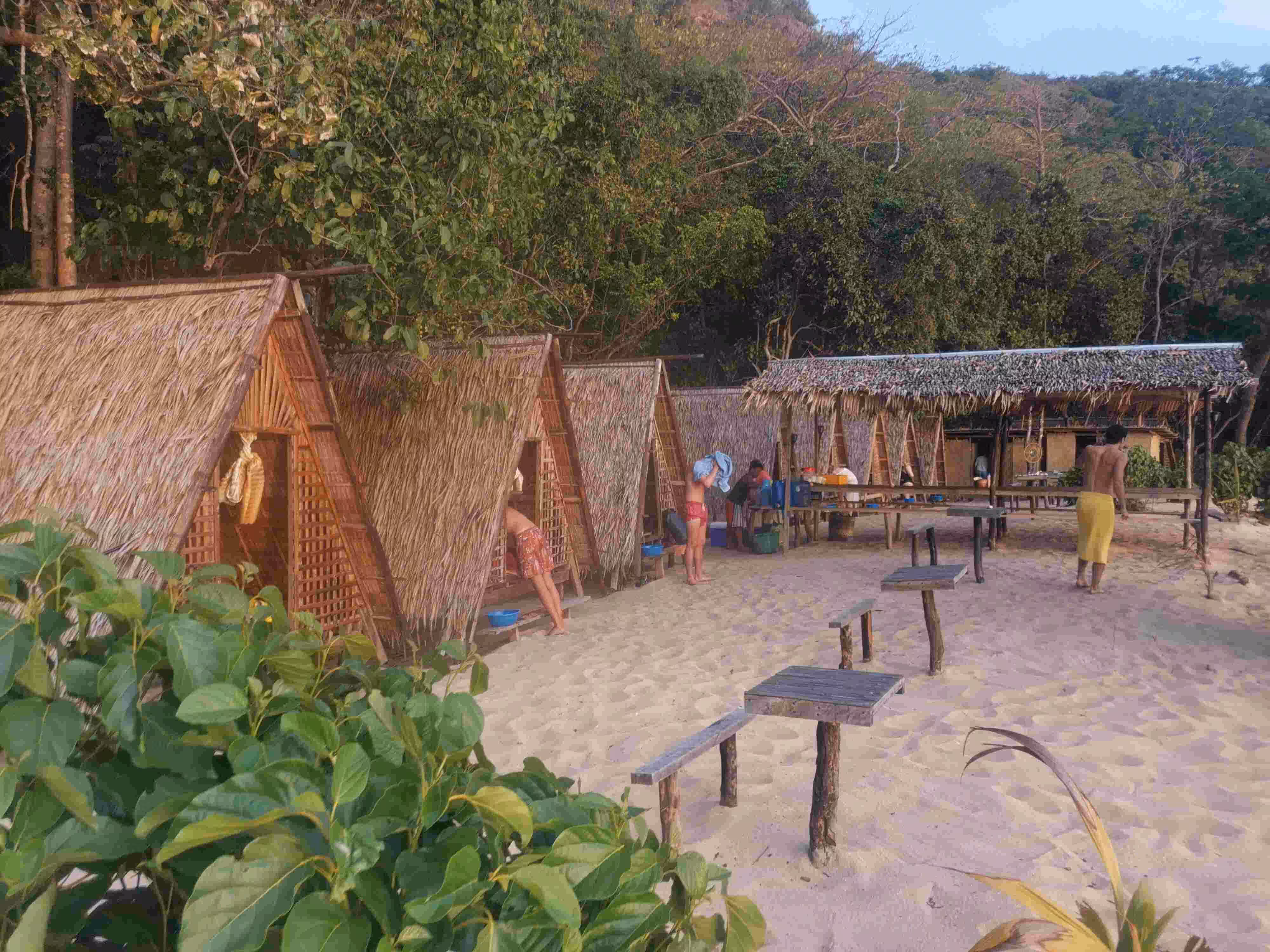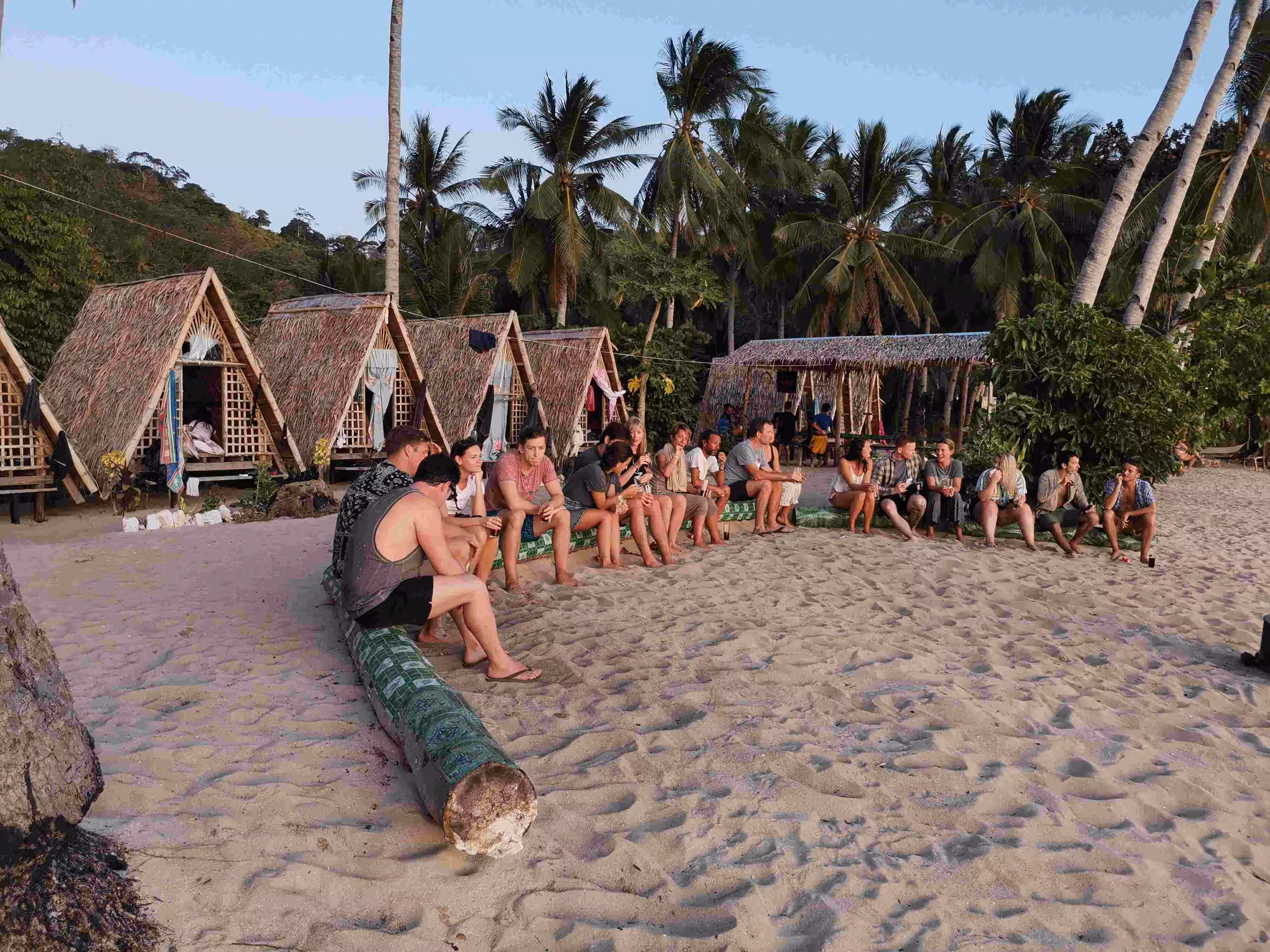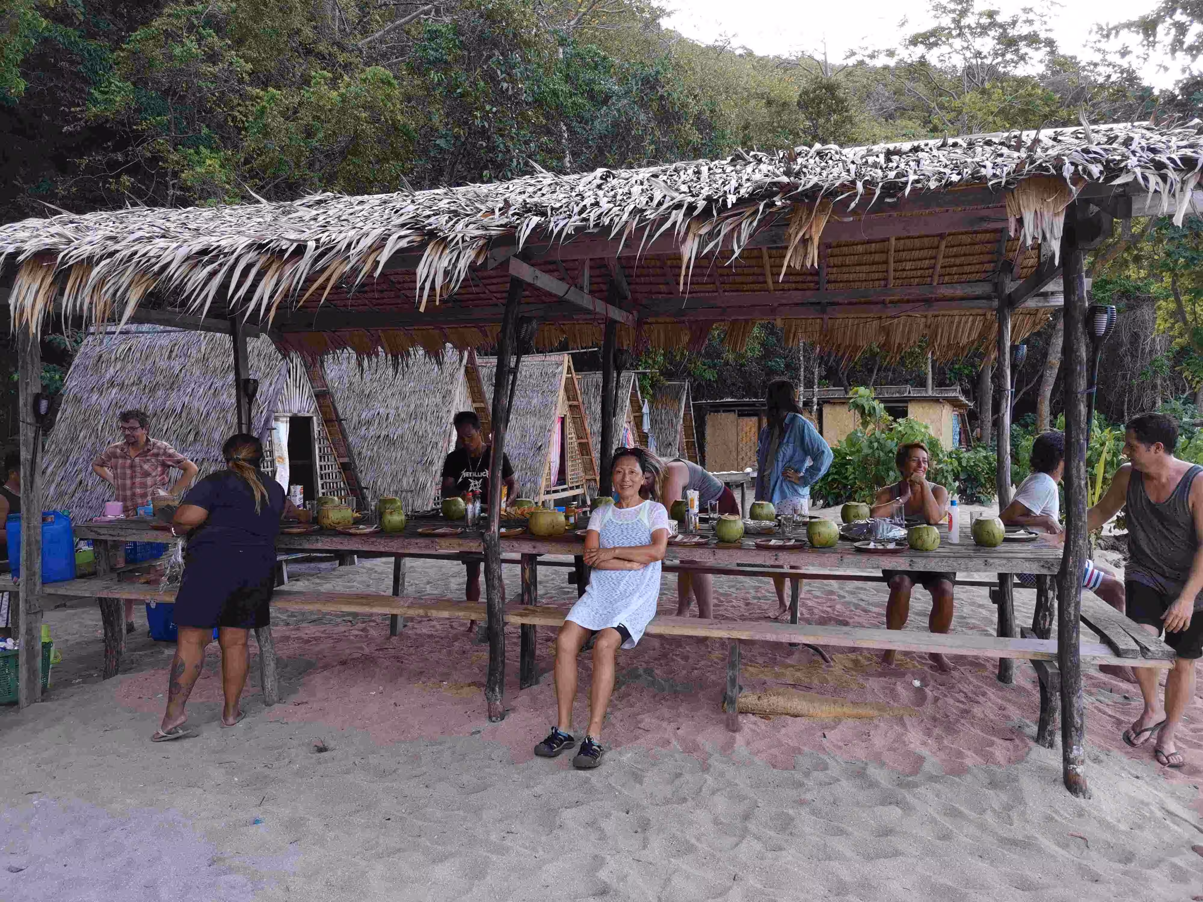 2020.02.03 – Lobog Beach Campsite – Balemben Beach Campsite (Php) – During the night, the wind kept the sand flies away but hindered somewhat our sleep as the door curtain and mosquito net kept on flapping in the wind. After an excellent breakfast at our campsite, again kayaked over from the boat, we continued our 2nd day itinerary with its 5 snorkeling/beach stops. Lunch was again served on the boat. We arrived at our 2nd night beach campsite shortly after 5pm. The huts, shower and toilets arrangement were similar to yesterday. We learned that the tour company had established these huts only in the past year as previously the tour participants would have slept in tents on the beach. Our second awesome tour day wrapped up with an excellent evening meal and a bonfire.