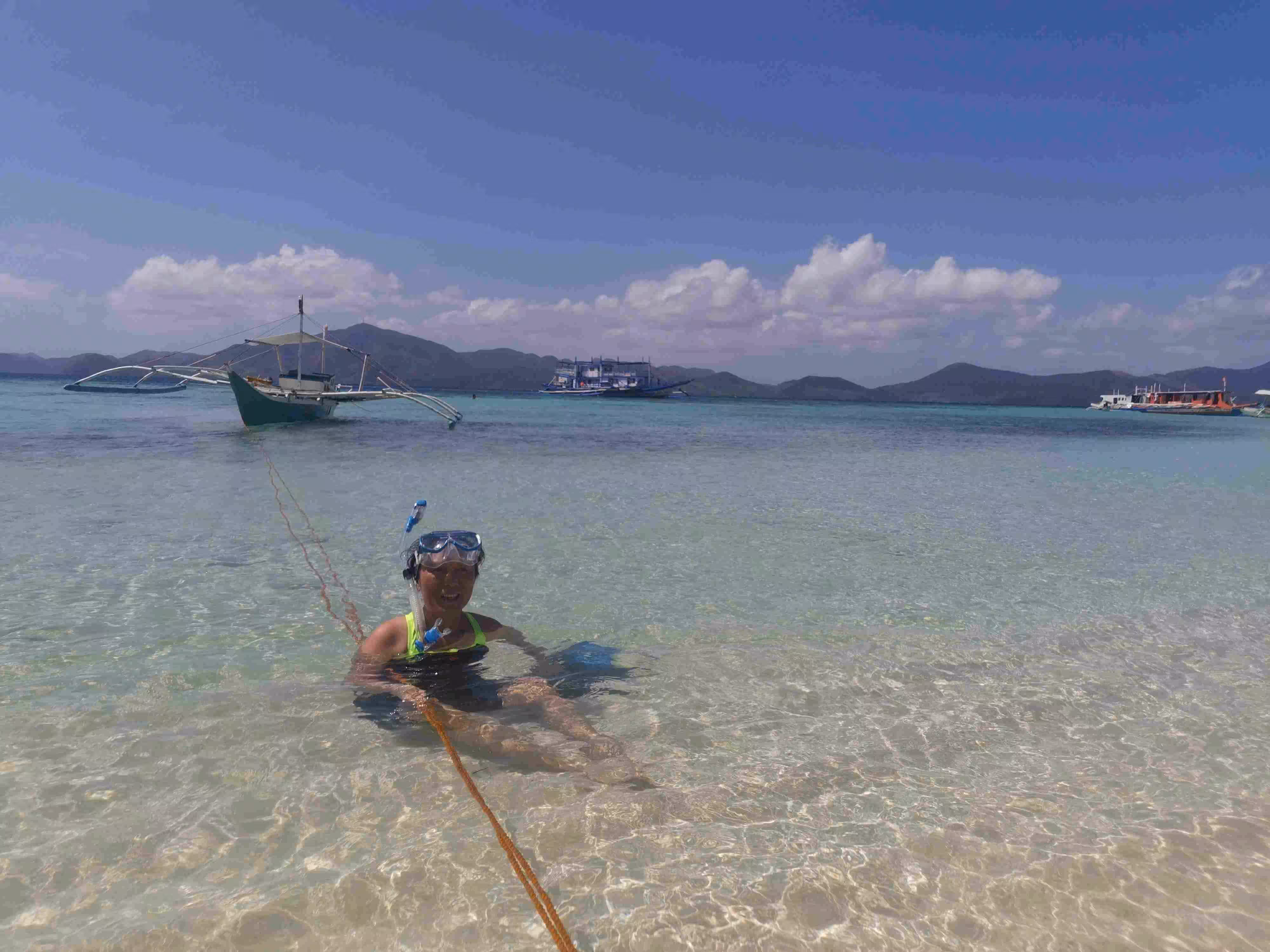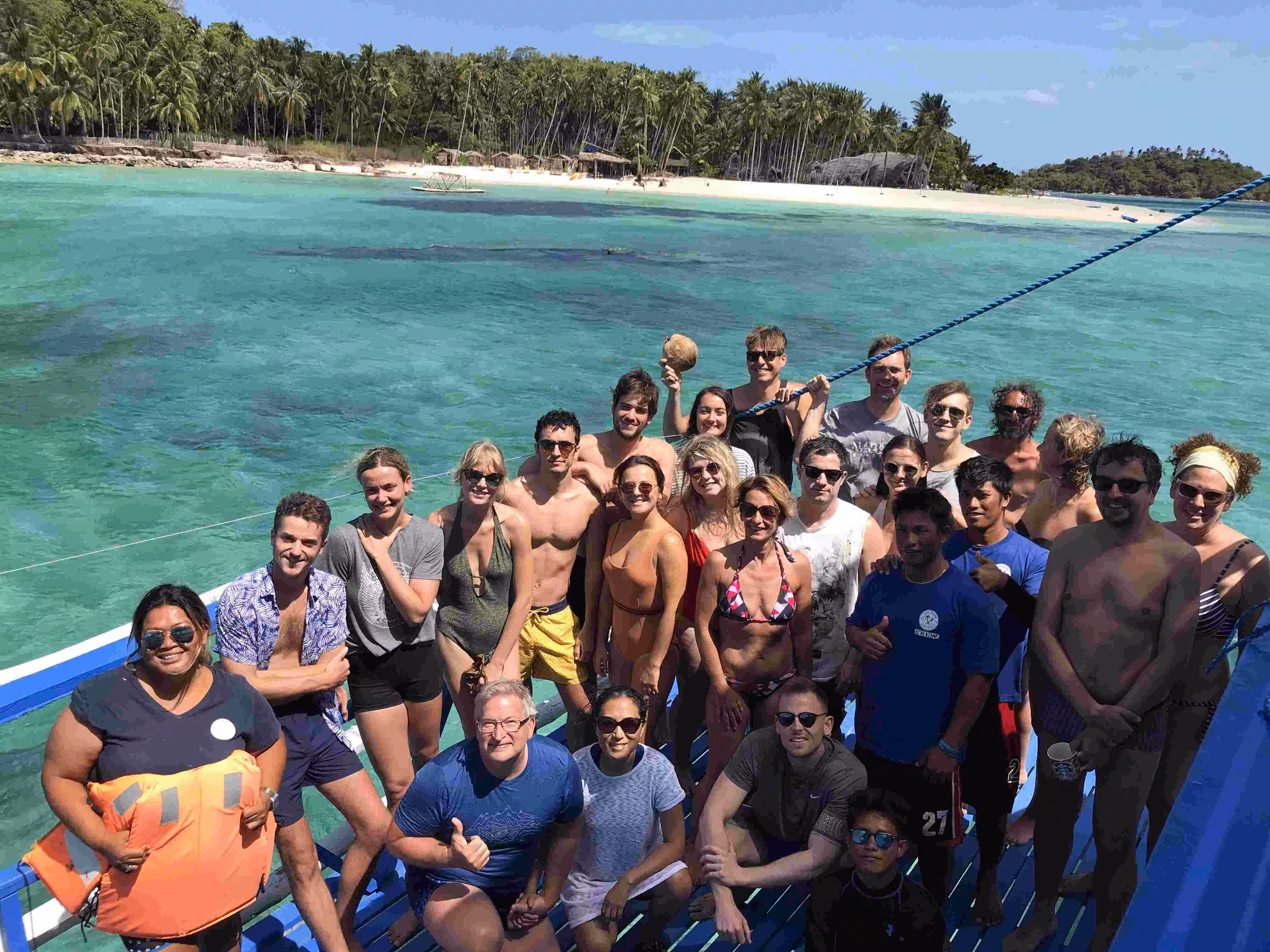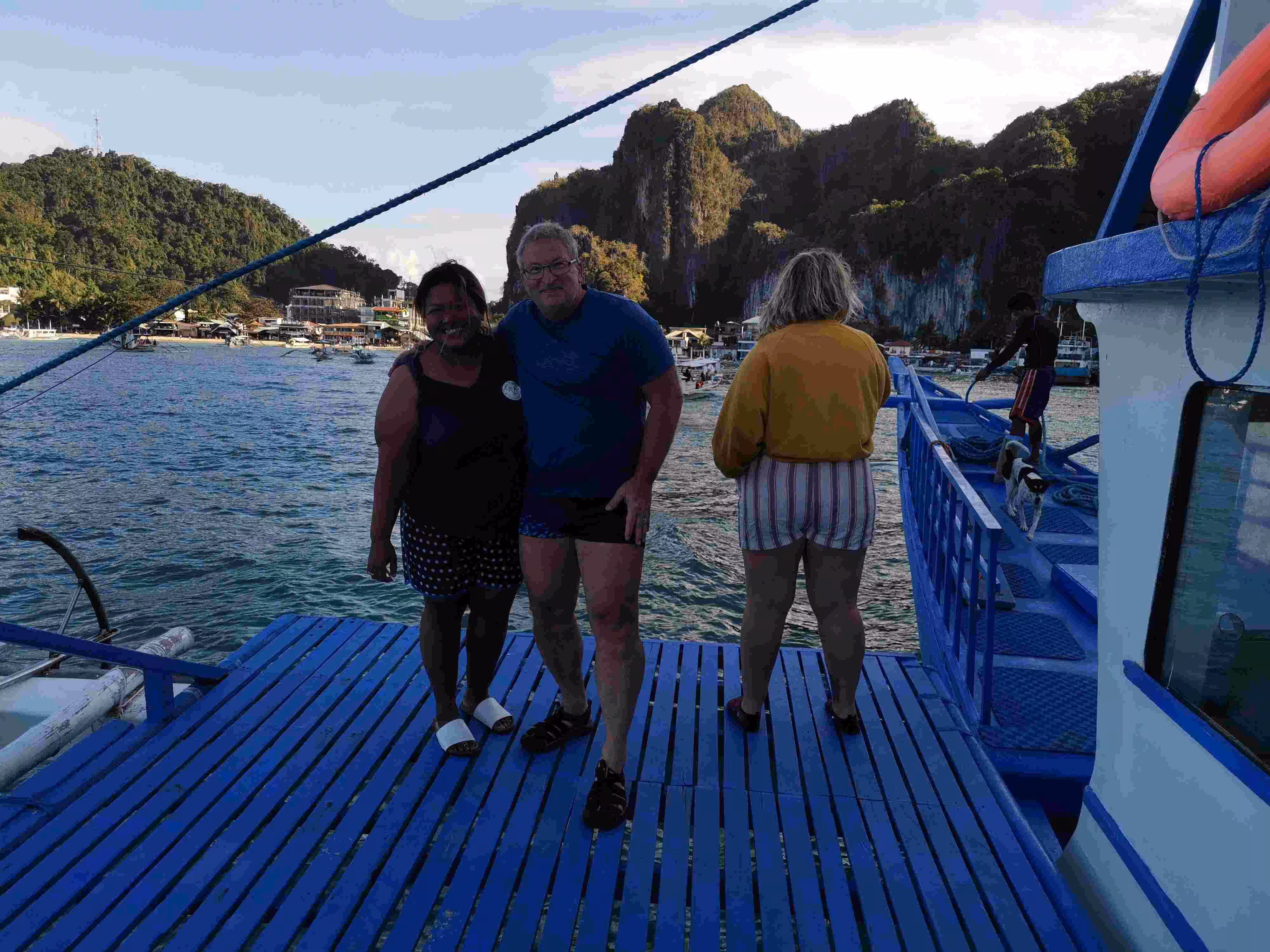 2020.02.02 – Coron – Lobog Beach Campsite (Php) – After our early breakfast at our hotel, we took a moto-tricycle to the Coron Port to join our Ultimate Adventure Tour 3D2N from Coron to El Nido. Although we could have taken a 3 to 5 hours fast ferry from Coron to El Nido, we had read many on-line recommendations for the 3 day 2 night adventure tour. The tour would allow us to reach many islands which would not be accessible through daily boat excursion. We arrived at the Coron port by 8:30am where we met briefly our tour leader and learned that our group size would be 21 for next three days. After having our luggage sniffed by a distracted chihuahua dog from the port’s K9 unit, we boarded our tour boat. The boat was much larger than we had anticipated. We had to wear life-vests on-board to comply with the coast guard rules. Our group included folks from the following countries: Italy (2), Austria (2), Denmark (4), UK (4), France (7) and Canada (2). Within a few hours on the boat, we all realized how attentive the 10 crew members and team leader were to our every need. Vanessa, our team leader, quickly presented us our 3 day itinerary. Before every stop, she would gather everyone for a short briefing. Our first night campsite was thoroughly well prepared and our hut was comfortable and cozy. As our boat could not dock on the island, guests could either snorkel to shore or take a kayak. Jenny became a frequent kayak passenger and kept the kayak boys busy. It felt like we were all contestants on the reality tv show Survivor – Philippines edition as we took our bucket shower. The prepared food was excellent and plentiful. We were all amazed by how the crew managed to cook all the meals on the boat’s small kitchen and kayak it to the island for us. A night bonfire completed the very enjoyable first day. Every one had retired to their huts for the night by 10:30pm.