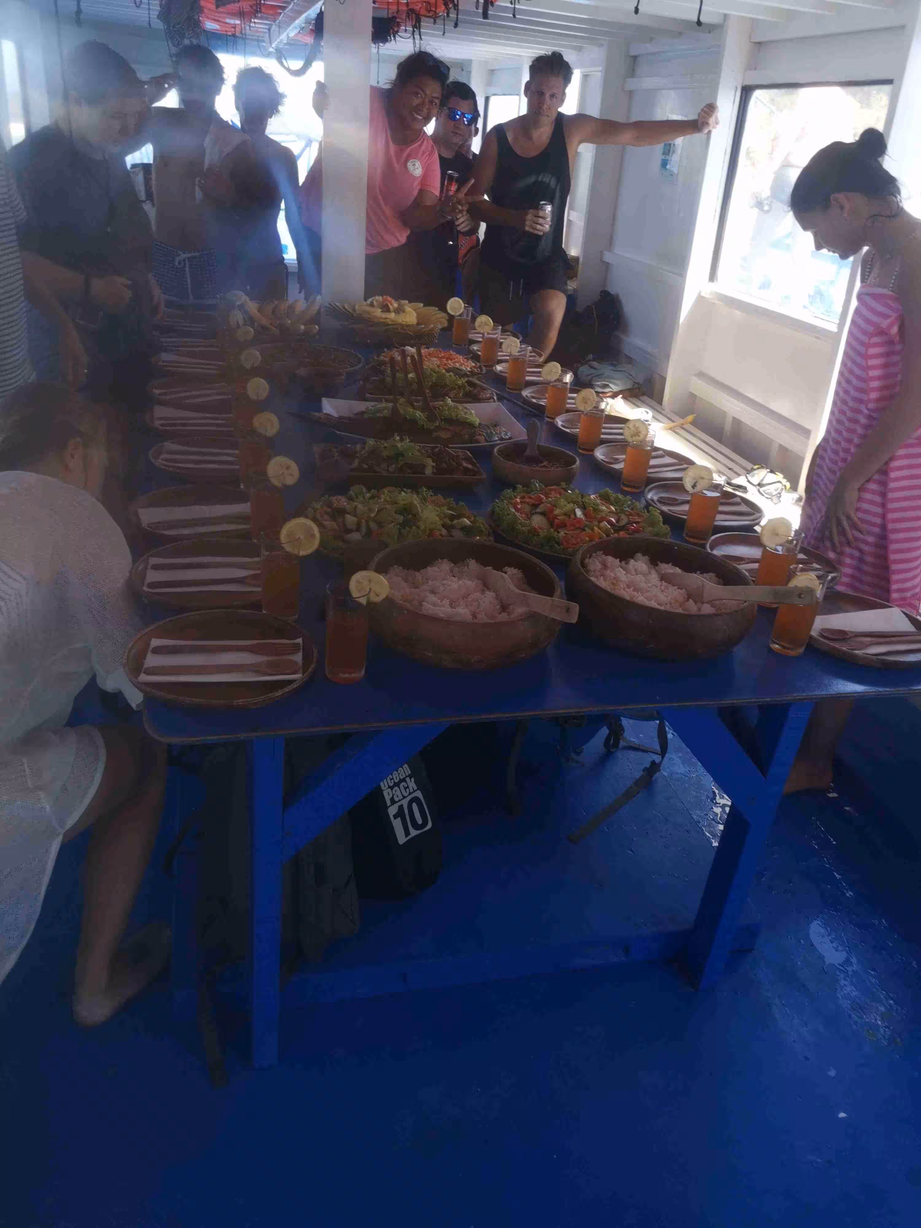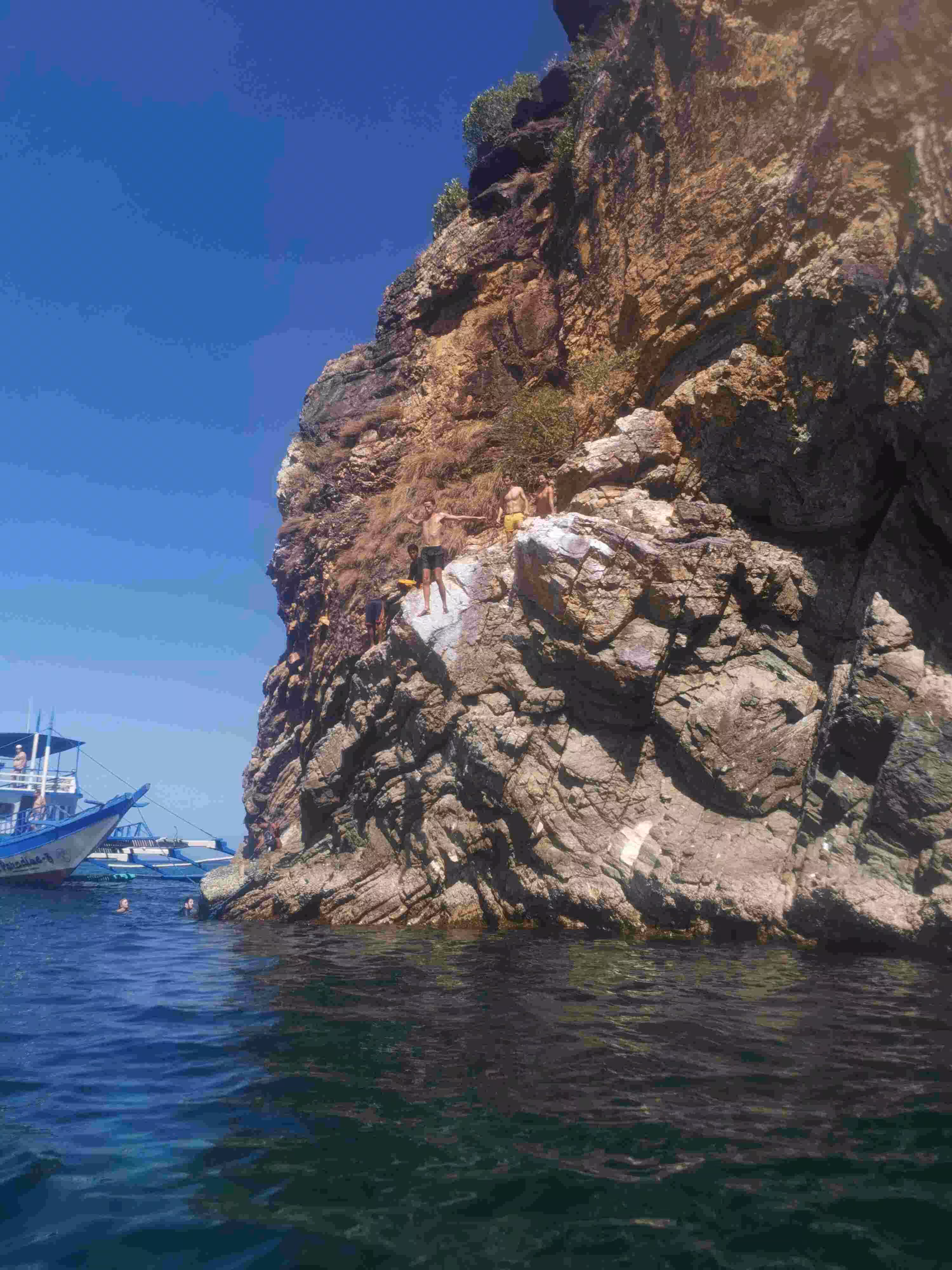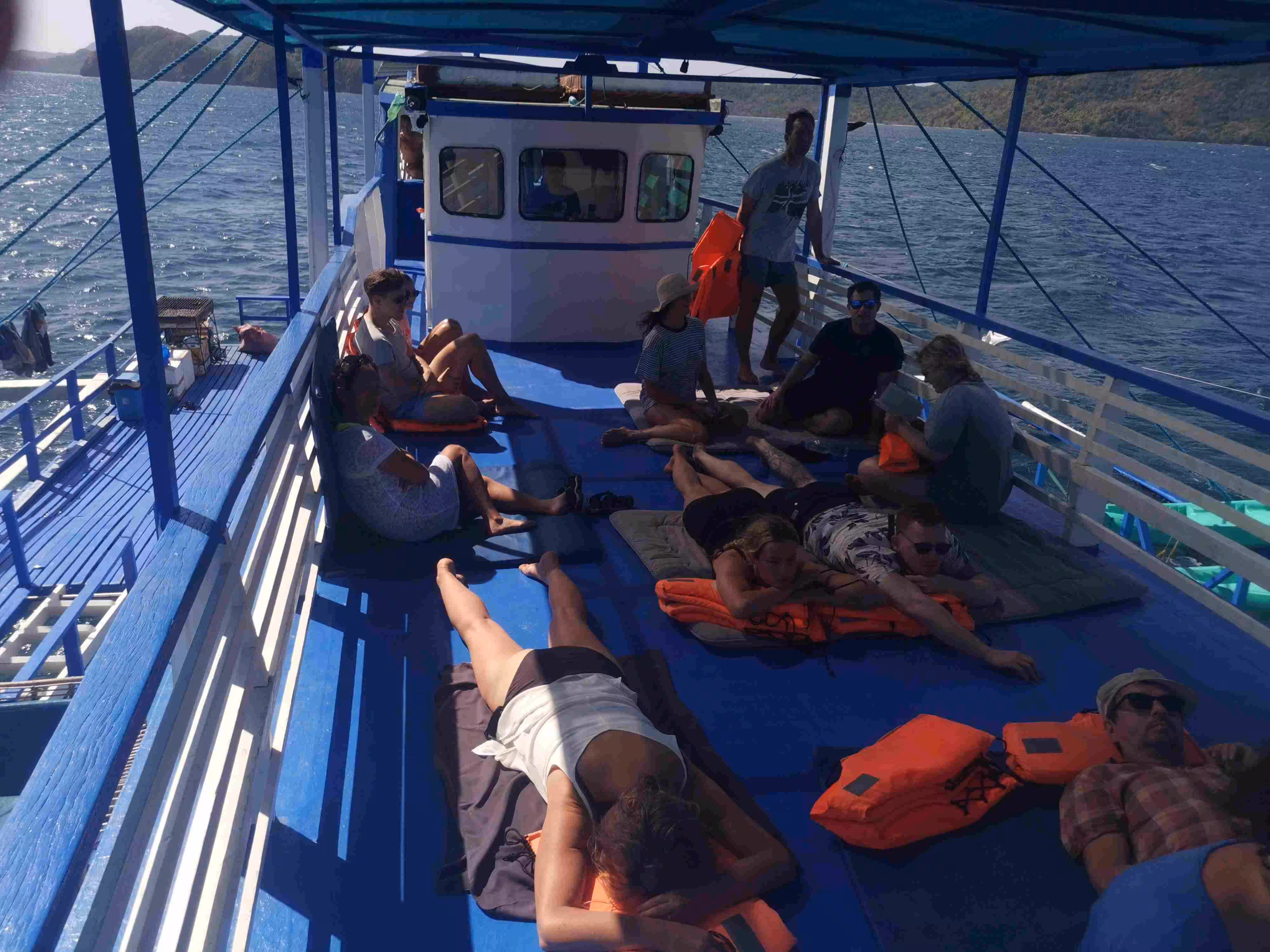 2020.02.02 – Coron – Lobog Beach Campsite (Php) – After our early breakfast at our hotel, we took a moto-tricycle to the Coron Port to join our Ultimate Adventure Tour 3D2N from Coron to El Nido. Although we could have taken a 3 to 5 hours fast ferry from Coron to El Nido, we had read many on-line recommendations for the 3 day 2 night adventure tour. The tour would allow us to reach many islands which would not be accessible through daily boat excursion. We arrived at the Coron port by 8:30am where we met briefly our tour leader and learned that our group size would be 21 for next three days. After having our luggage sniffed by a distracted chihuahua dog from the port’s K9 unit, we boarded our tour boat. The boat was much larger than we had anticipated. We had to wear life-vests on-board to comply with the coast guard rules. Our group included folks from the following countries: Italy (2), Austria (2), Denmark (4), UK (4), France (7) and Canada (2). Within a few hours on the boat, we all realized how attentive the 10 crew members and team leader were to our every need. Vanessa, our team leader, quickly presented us our 3 day itinerary. Before every stop, she would gather everyone for a short briefing. Our first night campsite was thoroughly well prepared and our hut was comfortable and cozy. As our boat could not dock on the island, guests could either snorkel to shore or take a kayak. Jenny became a frequent kayak passenger and kept the kayak boys busy. It felt like we were all contestants on the reality tv show Survivor – Philippines edition as we took our bucket shower. The prepared food was excellent and plentiful. We were all amazed by how the crew managed to cook all the meals on the boat’s small kitchen and kayak it to the island for us. A night bonfire completed the very enjoyable first day. Every one had retired to their huts for the night by 10:30pm.
