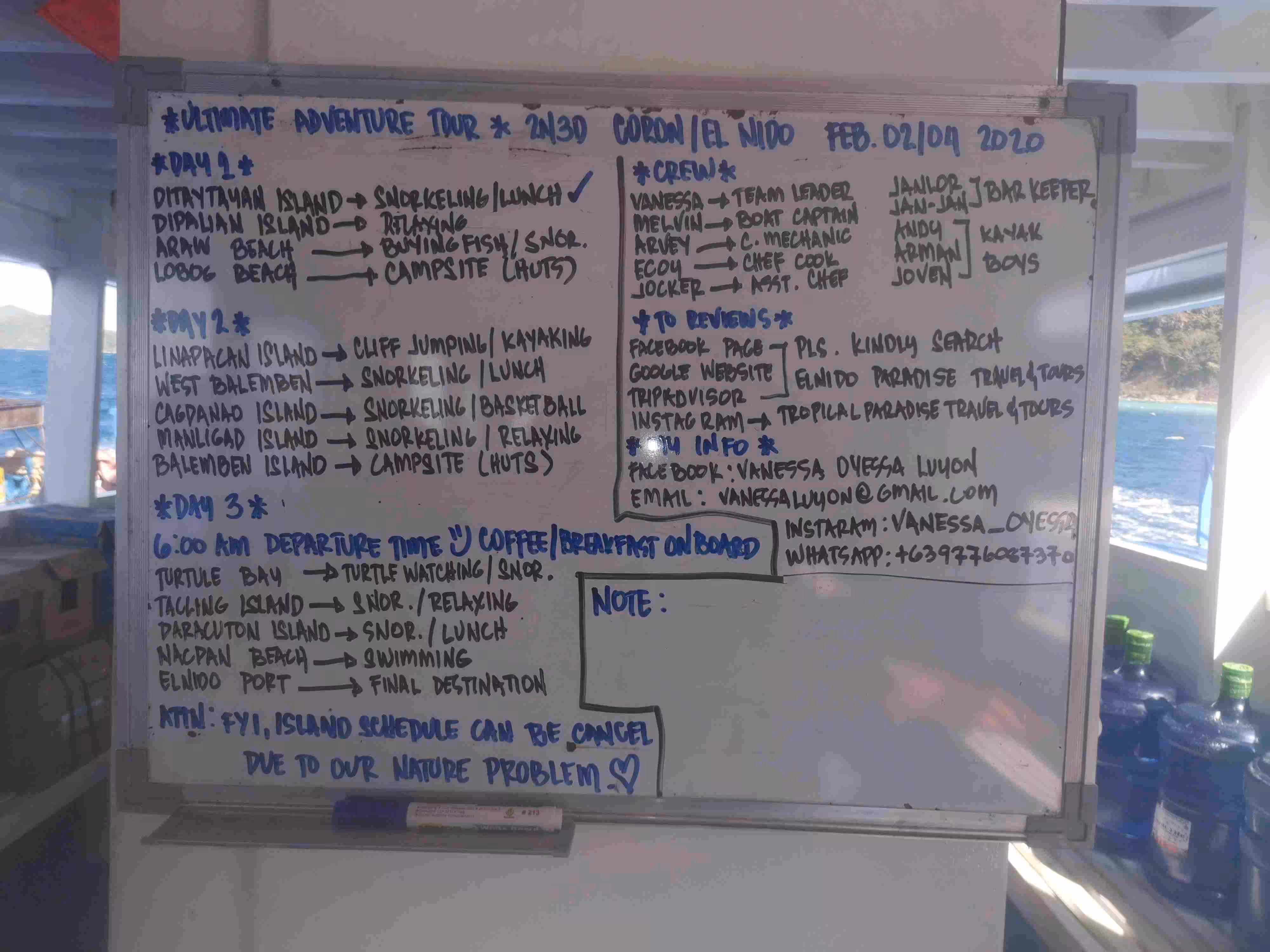 2020.02.04 – Balemben Beach Campsite – El Nido (Php) – We had an excellent night sleep but we had to wake up early in order to board the boat before 6am to reach a bay some 50 mins away which was known for its turtle population. The early morning snorkeling was rewarded by the sighting of three turtles. Later, we had breakfast on board of the boat. We continued our 3rd day itinerary with its 5 snorkeling/beach stops and arrived in El Nido by 4:30pm. Throughout the trip, we chatted with most of the participants about their travel plans. It was surprising to learn that 2019 N-Virus situation was altering travel plans for many, such as flight to Hong Kong being canceled or exchange study semester in Taiwan being deferred. Everyone appeared happy to have arrived in El Nido and were looking forward to the remainder of their respective travel journey. We left Vanessa and the boat crew with great memories and high regards for the company’s well oiled Tour. From the El Nido port, we took a moto-tricycle to our accommodation. During this short commute, we noticed that the town of El Nido was, like Coron, was overrun with tourists. After a welcomed shower at our accommodation, we went out for our evening meal. Later, we visited a few laundry services to inquiry about pricing, business hours and pickup time as we had accumulated a fair amount of clothes in need of a good freshwater wash.