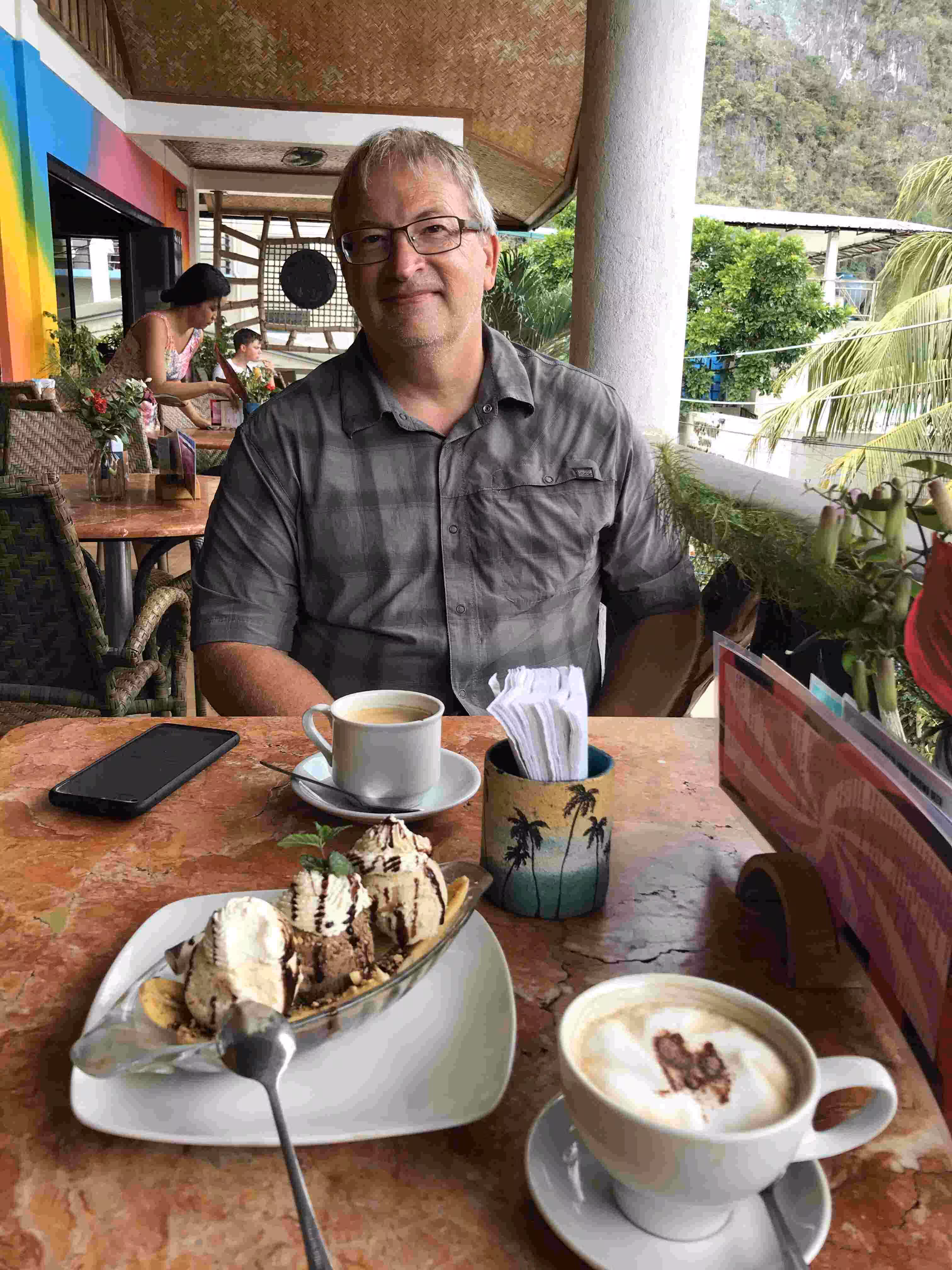 2020.02.05 – El Nido – El Nido (Php) – Before breakfast, we dropped off a 4kg load of clothes at a nearby laundry service. After breakfast, we walked over to the bus terminal to buy our tickets for tomorrow’s 5.5 hour journey to Puerto Princessa. Later, we took a moto-tricycle to the town center where we enjoyed some nice coffee and banana split. On the way back to our accommodation, we picked up our clothes and hanged them to dry outside our accommodation. In the evening, we took a moto-tricycle to a (very) expensive Italian restaurant for some pizza.