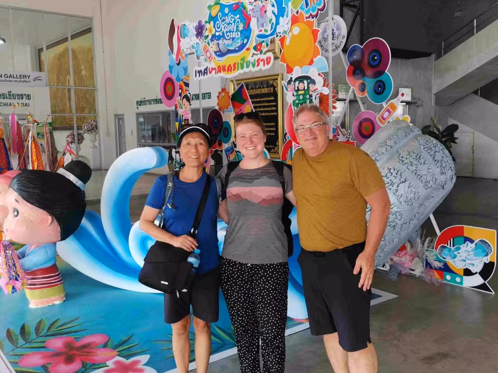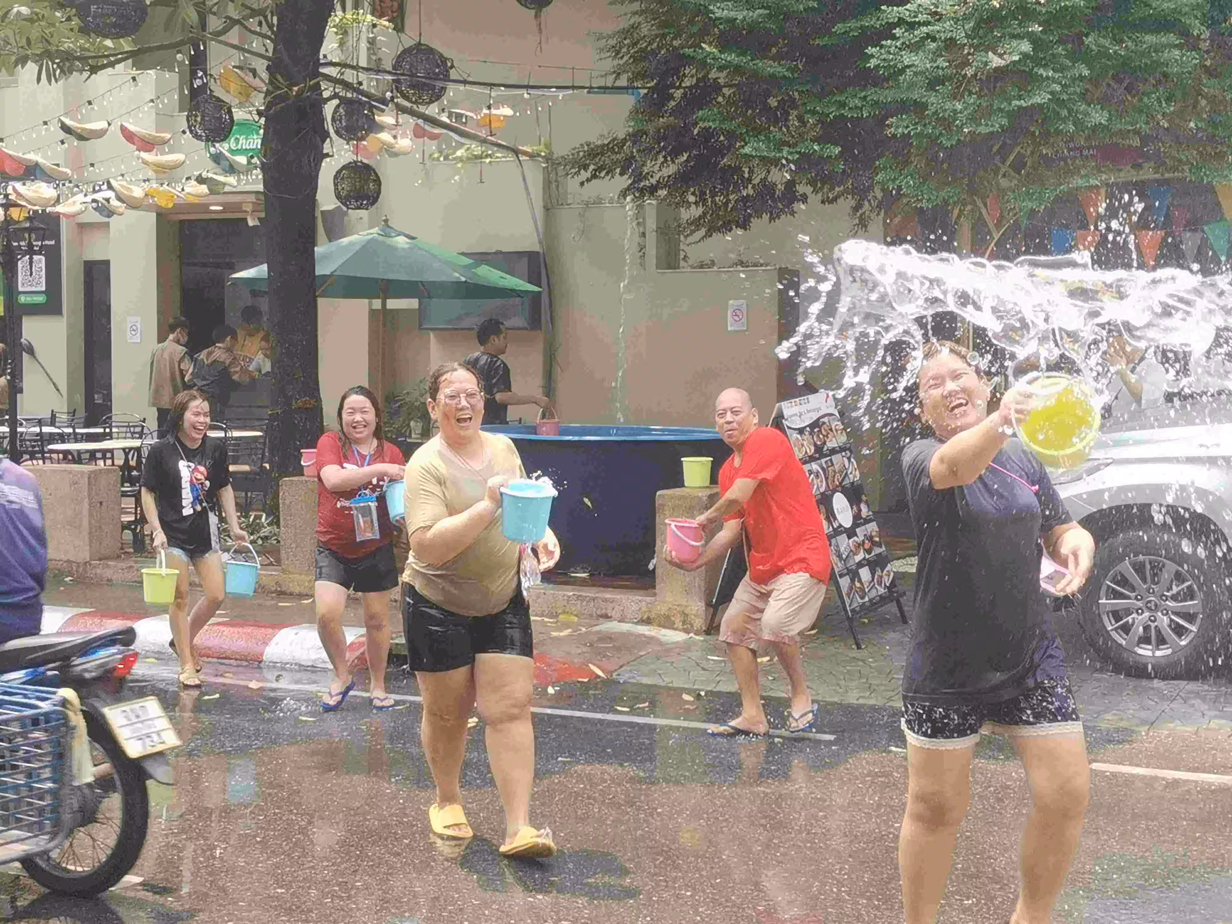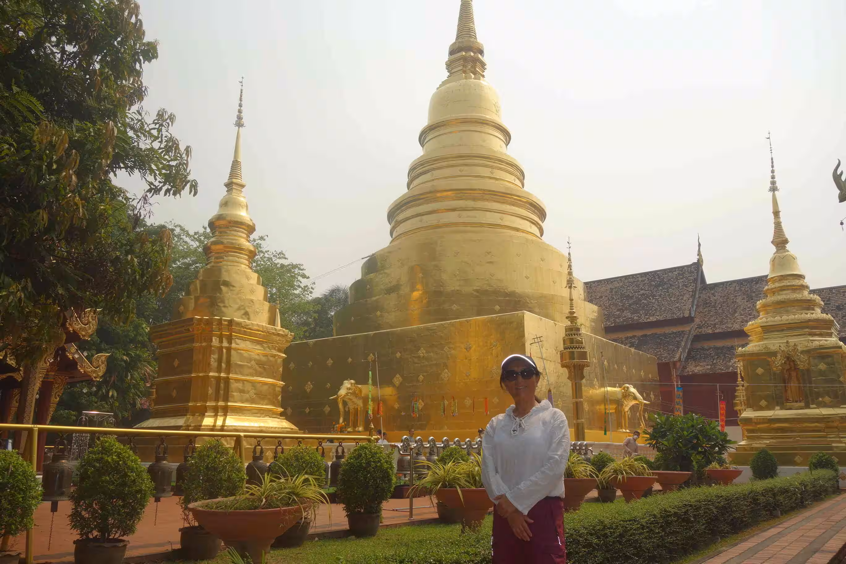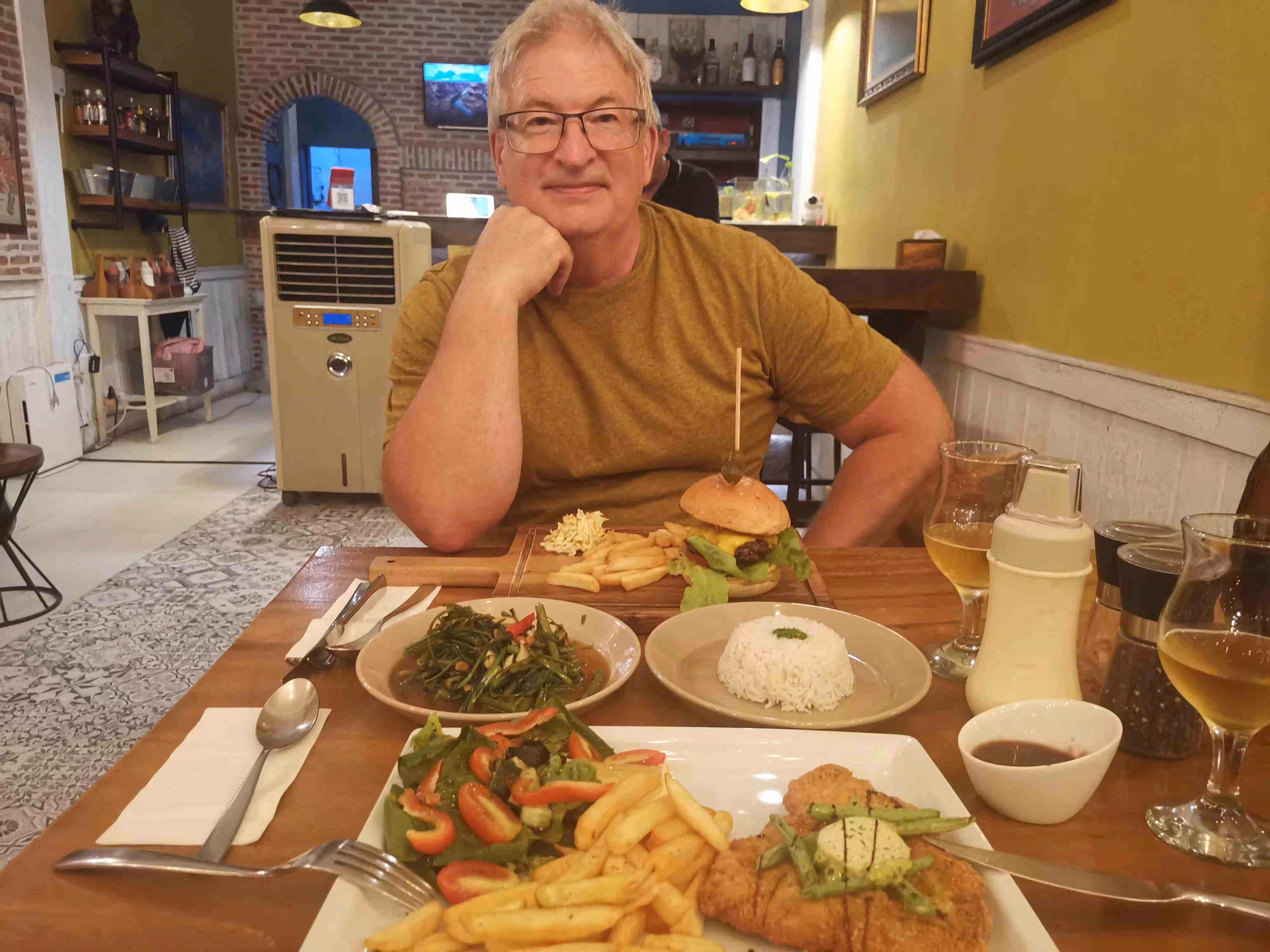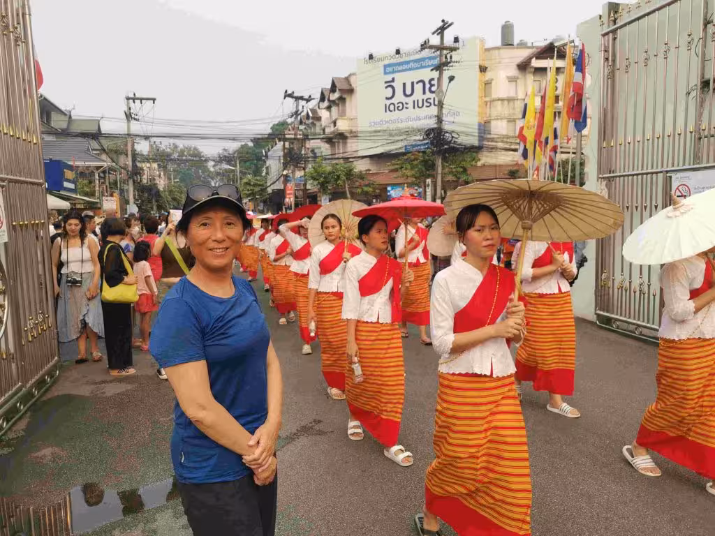 After a light breakfast, we rested in our room until 11:30am. We took a Grab back to the bus station. There, we met Sophia again, a solo female traveler from Switzerland, whom we first met in Vang Vieng, then in Luang Prabang. We took the opportunity to snap a group photo before bidding her farewell. Later, we boarded a comfortable bus from the GreenBus company. The 3.5h bus ride to Chiang Mai was even more scenic than our previous journey to Chiang Rai. After arriving at the bus station, we ordered a Grab to reach our hotel. To our surprise, we had our first female Grab driver on this trip. After checking into our hotel, we went to 7-eleven for some refreshments. Along the way, we witnessed a parade/procession at a nearby temple as part of the annual Songkran Festival. We had learned about this festival for a few weeks already. Songkran referred to the Thai New Year’s national holiday. It was celebrated on April 13th every year, but the holiday period extends from April 14th to 15th. We had dinner at a small nearby restaurant catering mostly to foreigners as I enjoyed a beef burger while Jenny had a plate of wiener schnitzel.