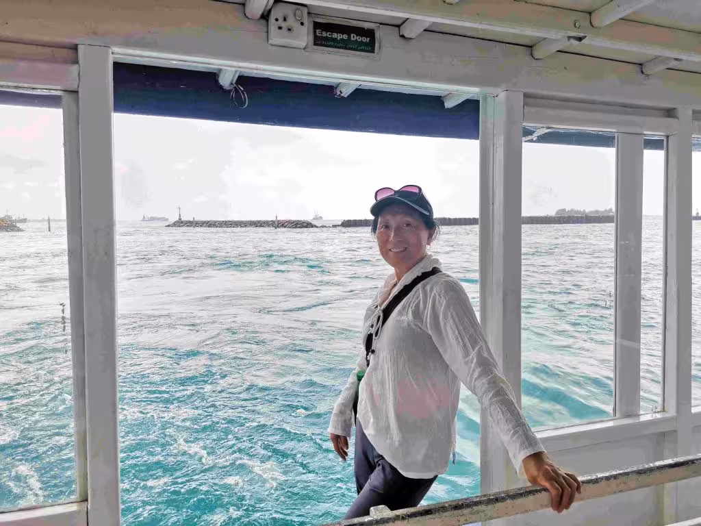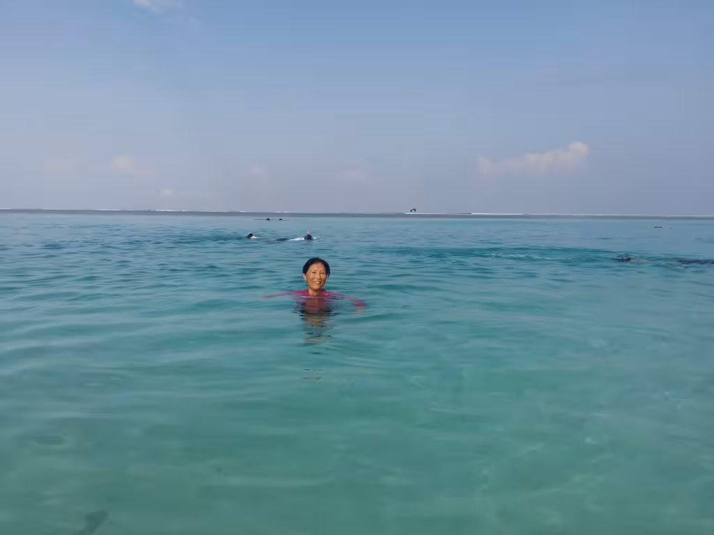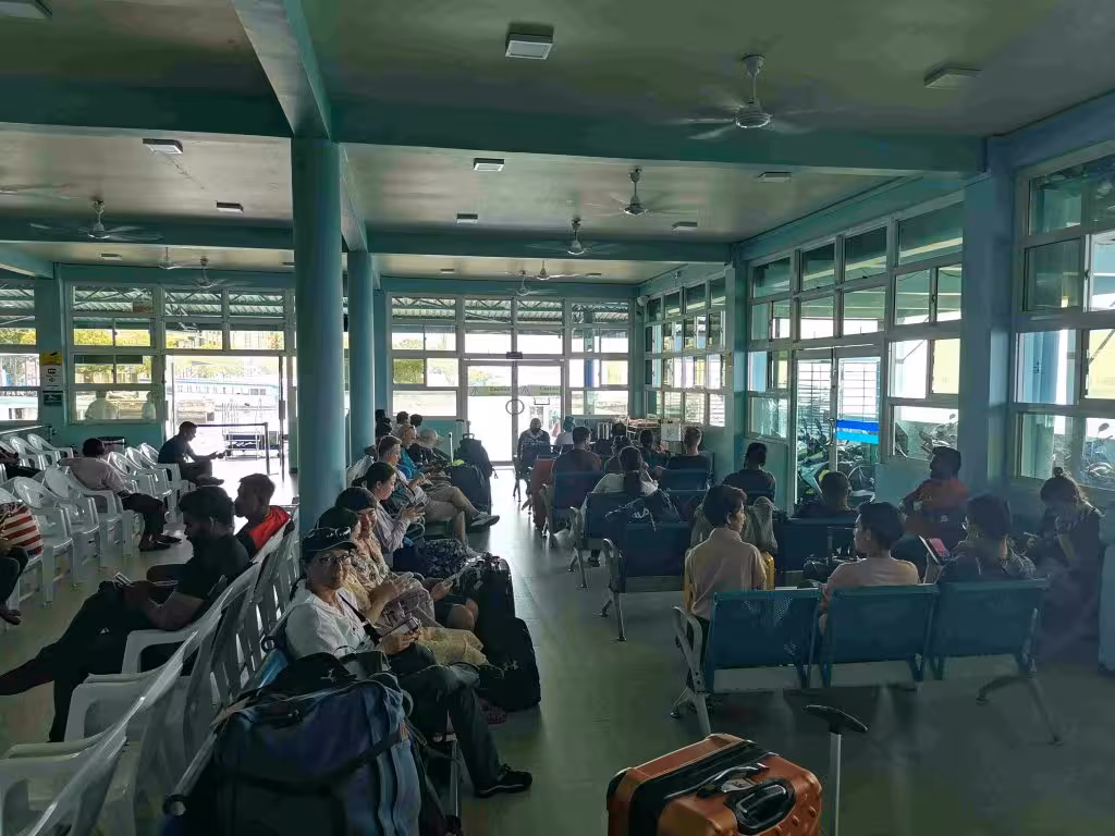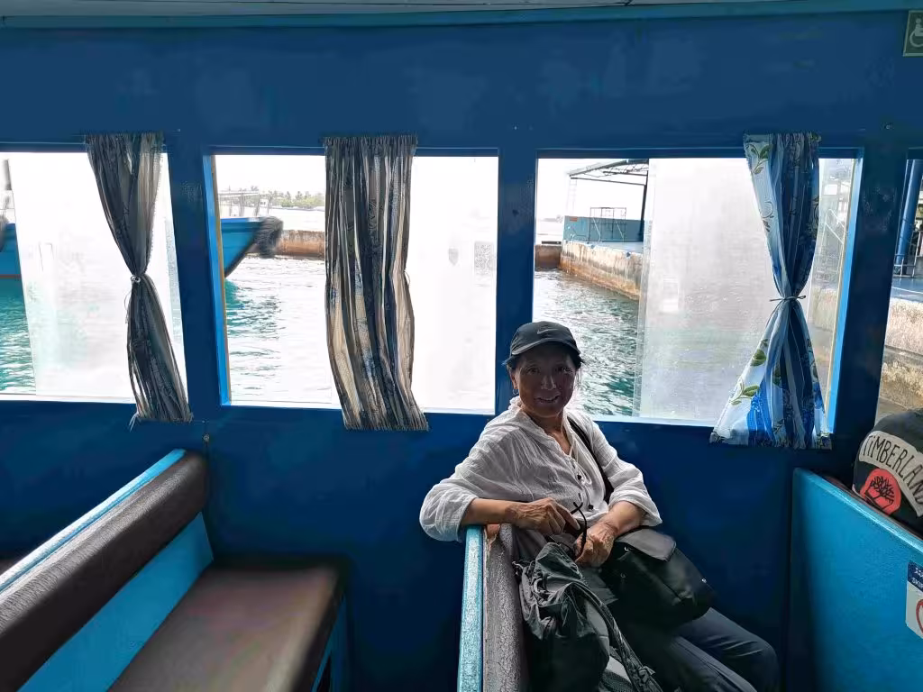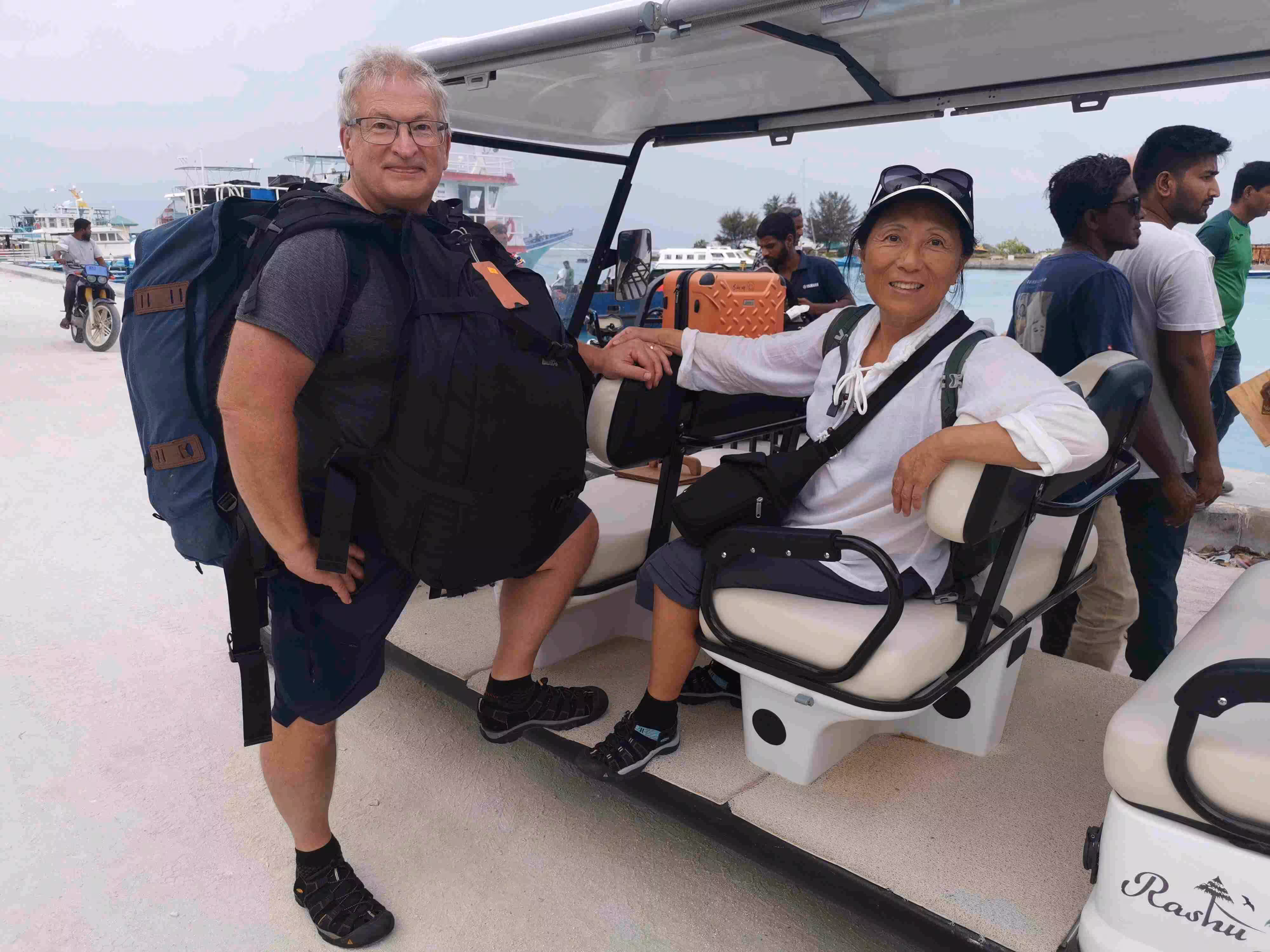 We left our hotel at 6am and quickly made our way to the airport’s international departure. The AirAsia check-in line was quite slow. Nonetheless, within less than one hour, we were having breakfast at McDonalds and waiting for our flight to Malé – the capital of the Maldives. We suffered through yet another AirAsia “no-service” flight. Sadly for us, this journey lasted almost 4.5hrs. Upon arriving at the airport, the immigration processing was fairly efficient – thanks to the fact that a bunch of folks were sent away to complete their arrival form. We were glad we had completed ours yesterday afternoon. After retrieving our luggage from the carousel, we made inquires at the information desk for the pier location of the public ferry destined to the island of Dhiffushi. We were glad we inquired as the information we had read online was not accurate or up-to-date. The pier was easily accessed by a $1pp ferry boat ride operating from the airport to the public ferry ticket office. Within less than 1hr after touching down in Malé, we were having a light lunch in a hotel restaurant while waiting for our 2:30pm public ferry to Dhiffushi. We opted to take the slow public ferry taking 3hrs but costing only $2pp rather than a scheduled speedboat taking only 50 min but costing $39pp. Because of scheduling differences, both transport boats were scheduled to arrive in Dhiffushi at a similar time. We rode the ferry with a few foreigners but the most were locals. As we arrived at the boat pier in Dhiffushi, staff from our hotel were waiting to pick us up in an electrical cart. After checking into our room, we had a short dip in the Indian Ocean before enjoying our hotel’s buffet dinner. To our relief, our hotel’s pre-paid meals appeared unaffected by Ramadan. The only constraint noted was that breakfast would be served within the confine of the restaurant as opposed to tables spread in the open-air beach front area. Also, we gained two hours over the time in Thailand.