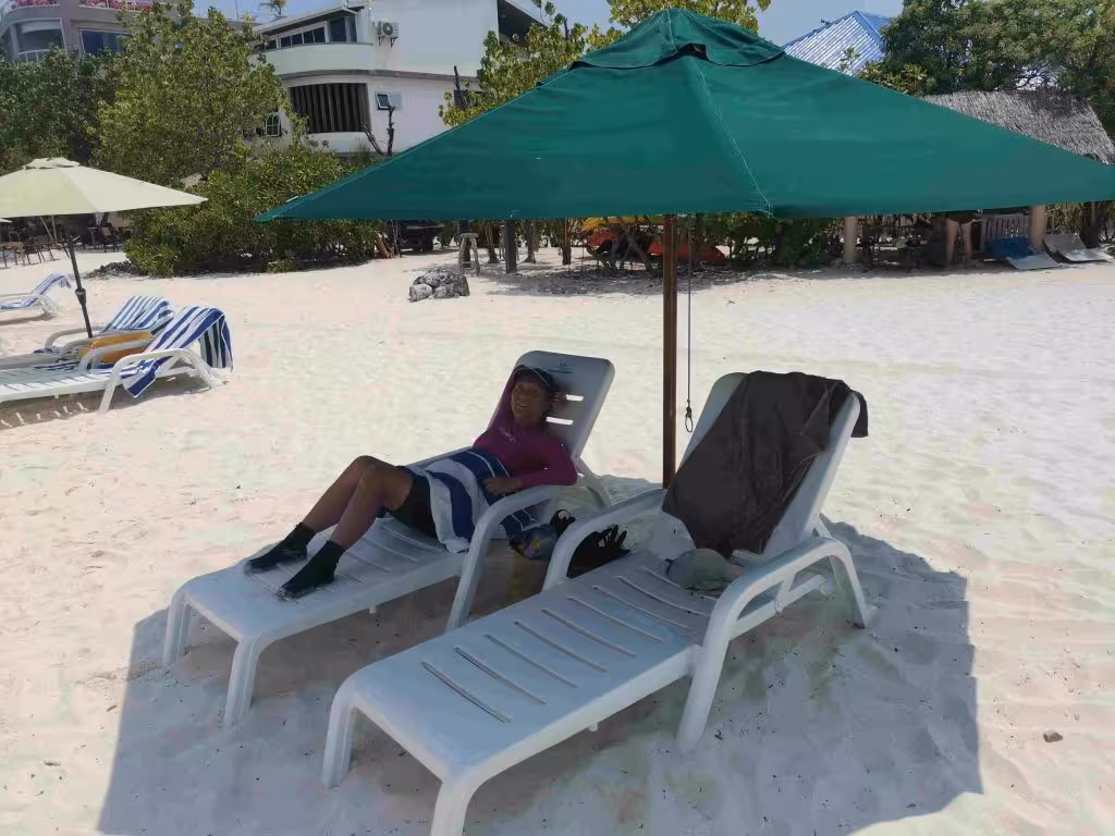 Breakfast, beach, snorkeling and dinner at our hotel/resort. In the morning, I rented a bicycle and cycled throughout the island over 1.5 hr.