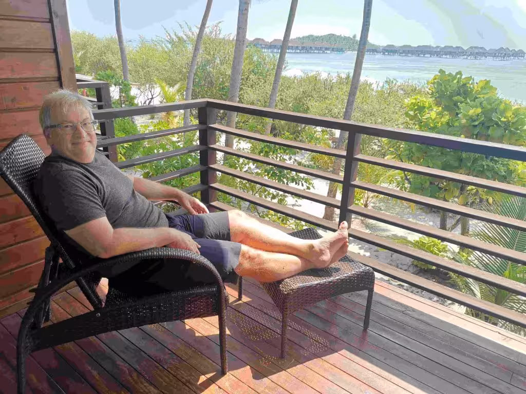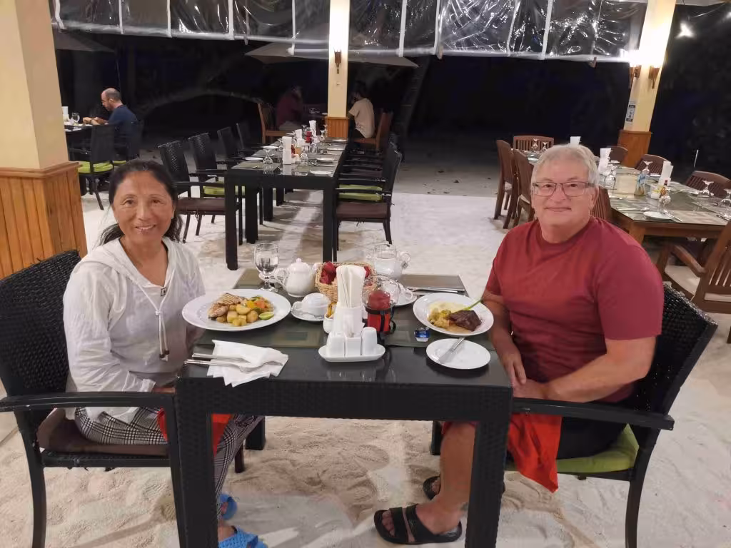We woke up early to catch the 6:30am slow ferry to the island of Huraa. Our hotel had kindly provided us with a light take-away breakfast. Upon arriving in Huraa, we were picked up at the boat pier by our hotel-resort staff. We were very pleased when we were advised that we could check into our room – even though it was only 9am. We learned that a group of flight attendants from Italy who regularly stayed at the resort after their flights benefited from a nice occupational perk of a 4 night stay. Beyond the dozen of flight attendants and us, there were only a handful of other guests at our resort. We marveled at the view from our 2nd floor room. Although we were quite pleased with our hotel/resort room, we knew our island was sandwiched to the north and south by two private resort islands. We kept on hoping the guests checked into those over-the-water villas at $1,000USD/night were getting their money’s worth. A stone throw away in the south of our island was a Four Season luxury resort while in the north we faced an expansive Club Med resort. In the late afternoon, we had our first snorkeling outing directly off the beach. We felt the underwater experience much better than on the island of Dhiffushi. After eating buffet breakfast and dinner at our first hotel in Dhiffushi, it was refreshing to order from a table d’hôte menu. The food was nicely prepared and obviously delicious.